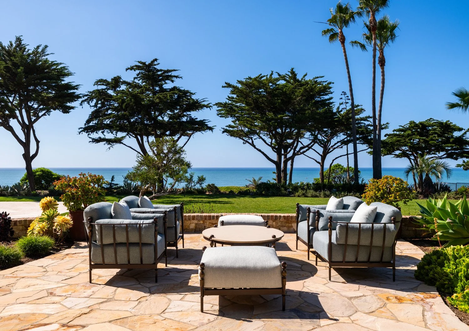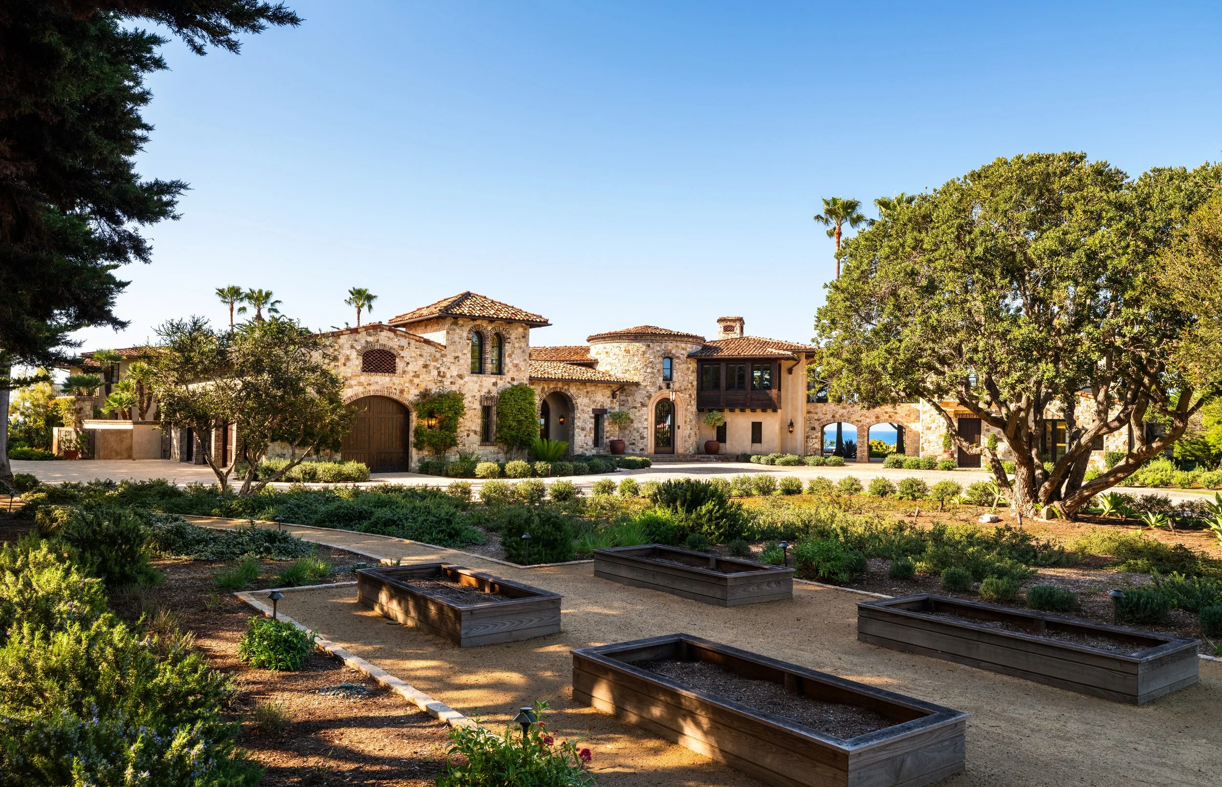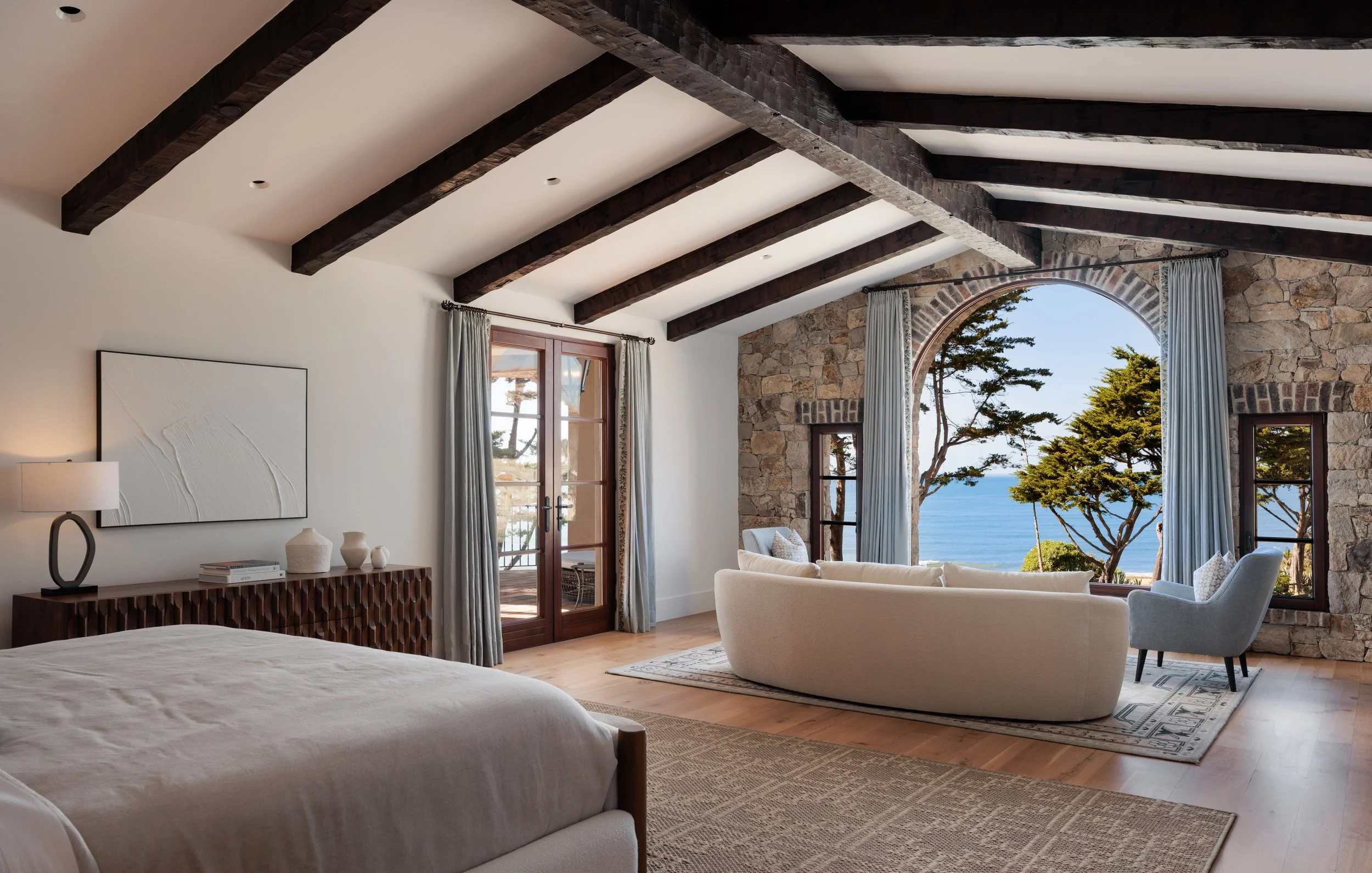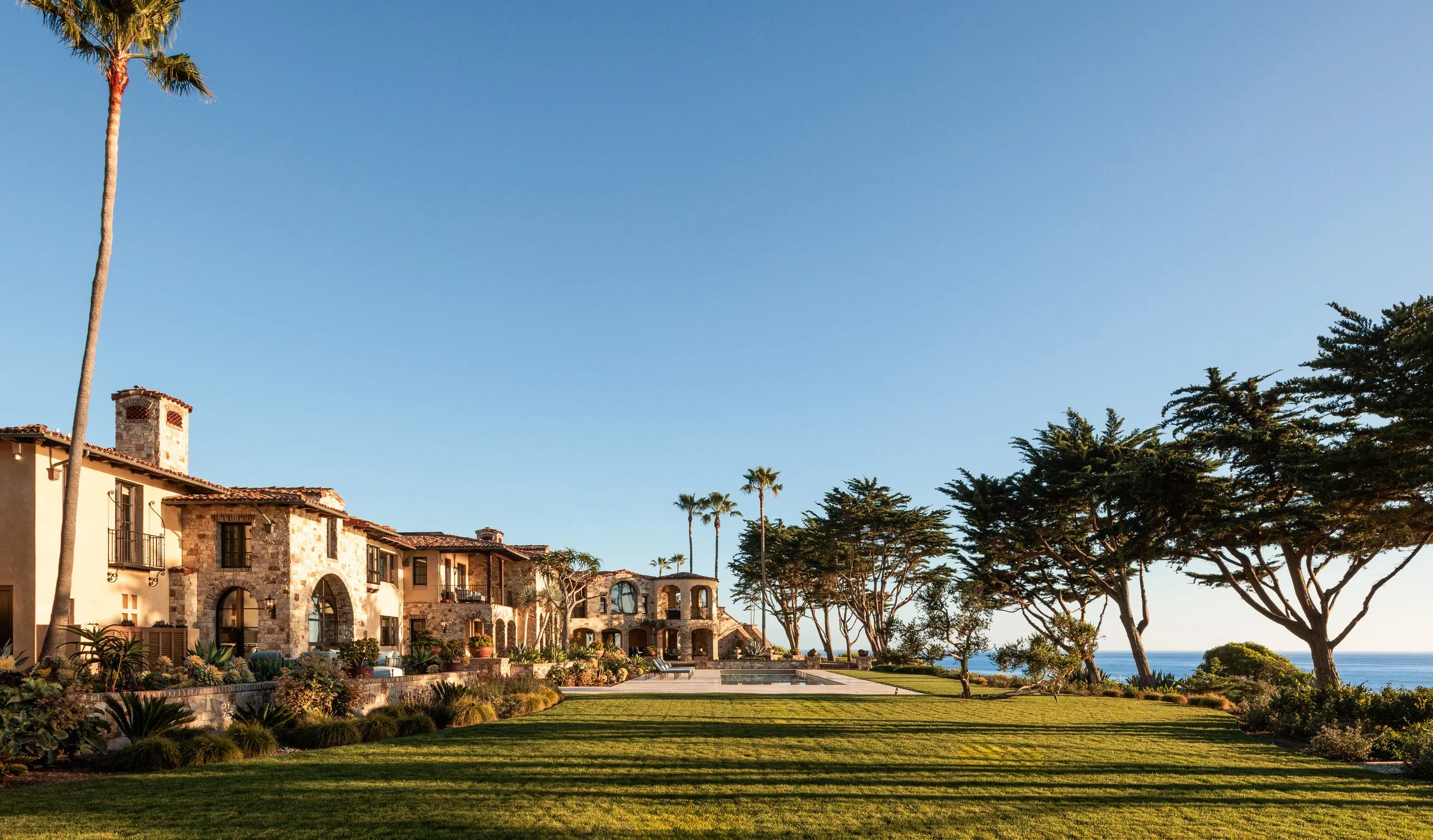 Spanning approximately 13,000 square feet, the compound offers seven bedrooms, seven full baths, and three half baths across expansive formal and informal living environments, along with a separate three-bedroom guest residence. A dramatic primary suite with private sitting room and terrace anchors the home, while every major space opens to gardens, terraces, or uninterrupted ocean horizon. The grounds unfold across sweeping lawns, secluded courtyards, and layered terraces leading to roughly 450 feet of ocean frontage and a striking 55-foot pool oriented toward uninterrupted coastal views. An event lawn and nine-car garage complete an estate designed equally for private retreat and large-scale coastal entertaining.